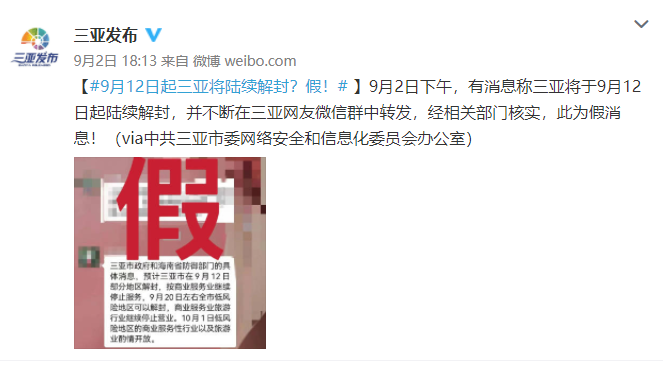 9月2日下午,有消息称三亚将于9月12日起陆续解封,并不断在三亚网友微信群中转发。经相关部门核实,此为假消息!