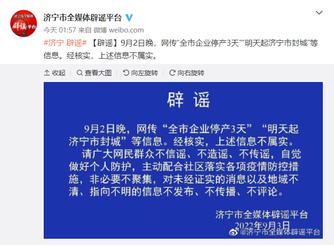 三、网传“济宁市企业停产3天”“明天起济宁封城”?