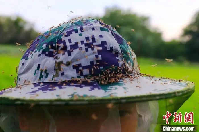 资料图:防蚊帽上落满了蚊虫。徐明远 摄