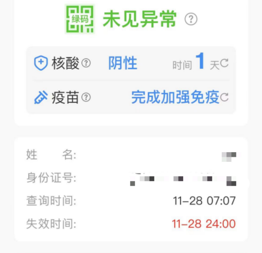 11月28日早上7点,记者打开北京健康宝进行核酸自查,结果显示:阴性。