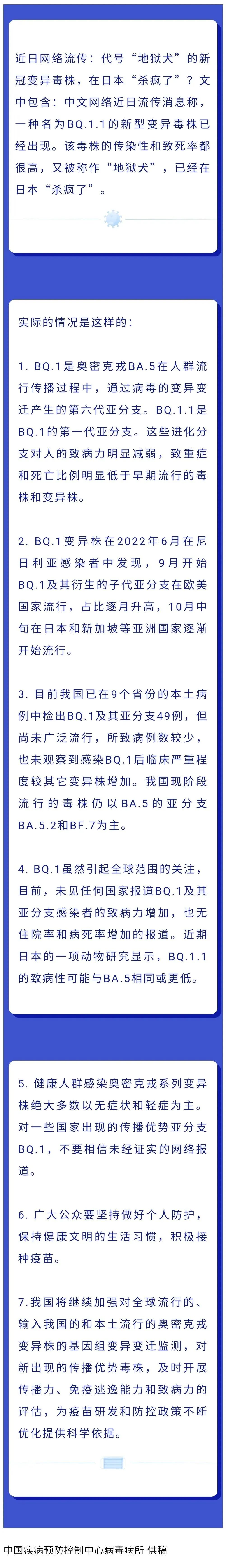 新冠疫情在全球暴发以来,病毒已发生多轮变异。10月3日至9日的全球流感共享数据库(GISAID)数据显示,BQ.1*(BQ.1系列毒株)已经在65个国家被发现。网传“该毒株的传染性和致死率都很高,被称作‘地狱犬’,已经在日本‘杀疯了’”。那么,真相如何?