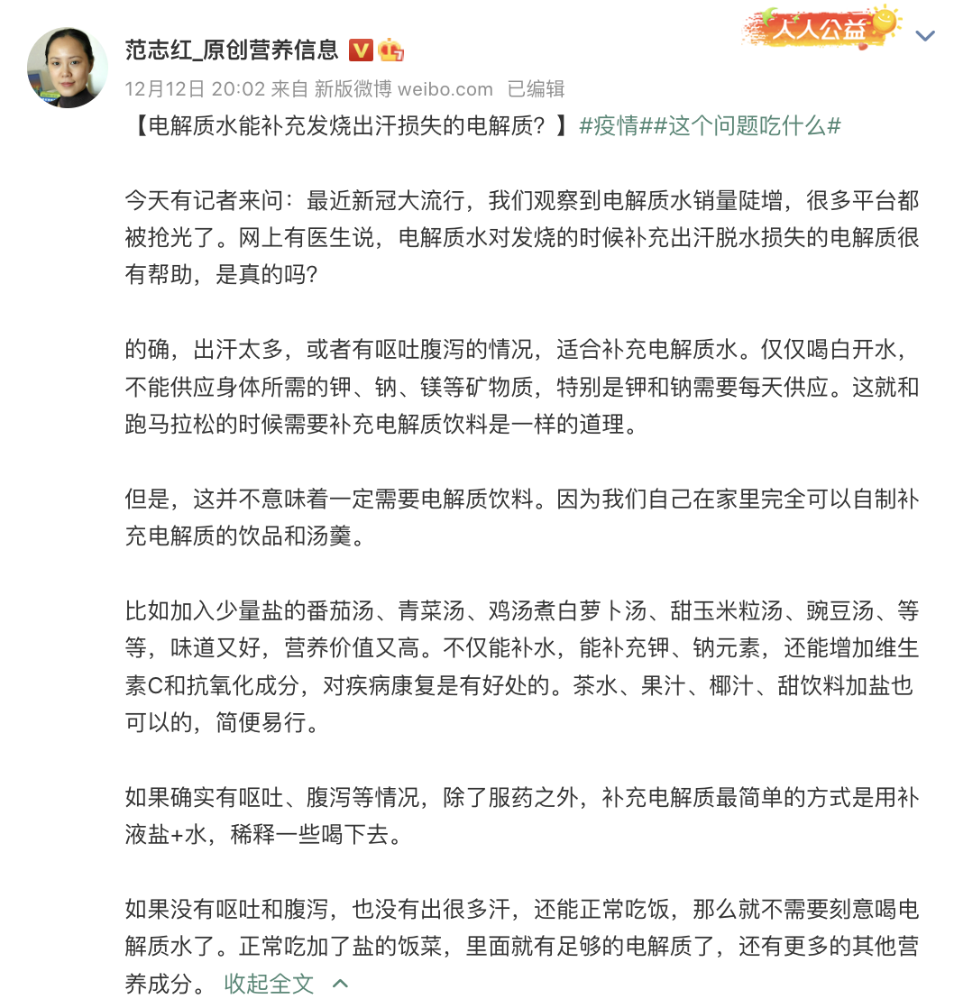他建议,吃水果、喝粥、医用补液盐或者电解质饮料,都是补充人体流失电解质的办法。