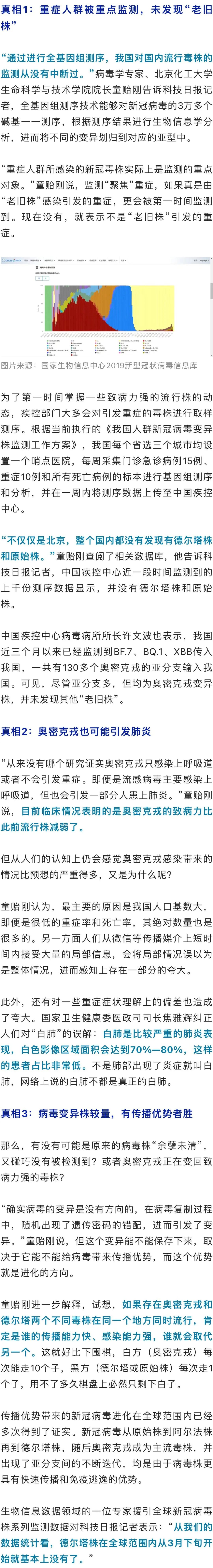 针对有关传言,北京市疾控中心传染病地方病控制所研究员潘阳也表示,近两个月来,北京市流行的新冠病毒为奥密克戎变异株BF.7分支和BA.5.2分支,没有在社会面发现XBB、BQ.1等变异株流行,也没有发现原始株、德尔塔等非奥密克戎变异株的流行。同时,他还回应了舆论关心的热点问题: