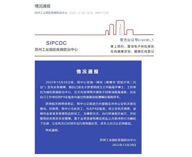 12月27日,苏州工业园区网信办工作人员表示,该消息不实,园区内只有P2实验室,没有P4实验室,该网友也并非园区疾控中心员工。目前,该发文网友已自行申请关闭微博账号。