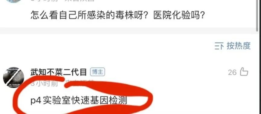 至于如何知道自己感染了两种毒株,@武知不菜二代目 则宣称自己在苏州工业园区疾病防治中心(Sipcdc)工作,还称自己是在P4实验室里通过快速基因检测得知相关信息的。