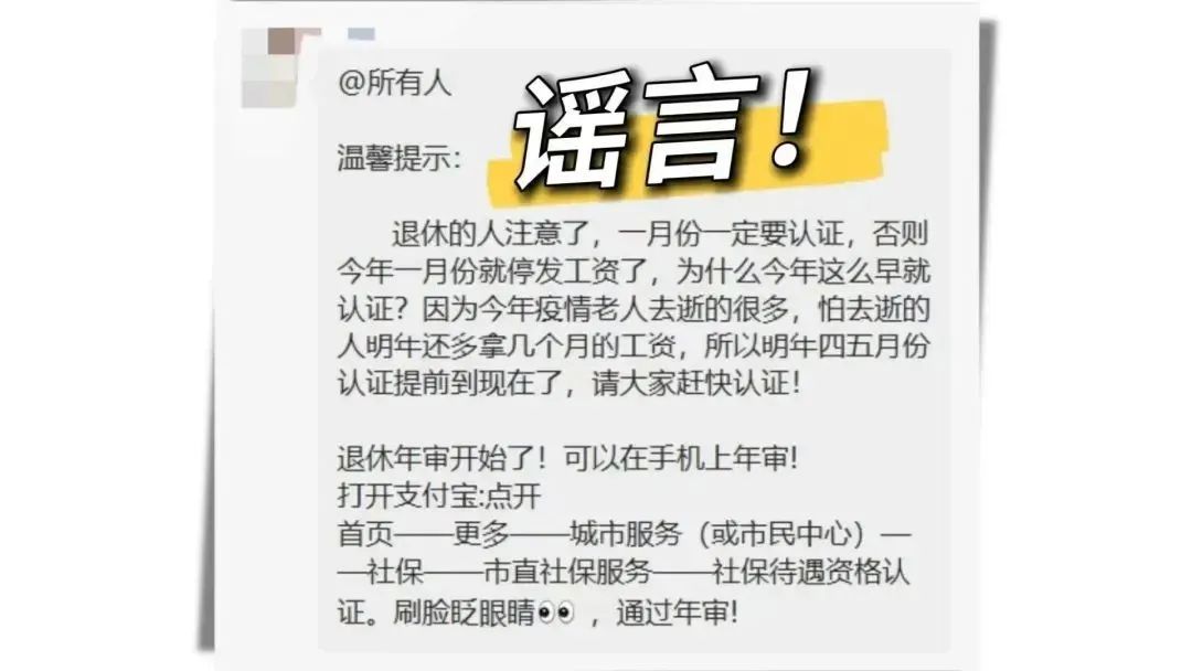 近日,有网友发帖咨询:近期微信群广泛流传“因疫情原因,本月不进行社保资格认证的退休人员,将停发一月份工资”信息,请问此消息是否属实?