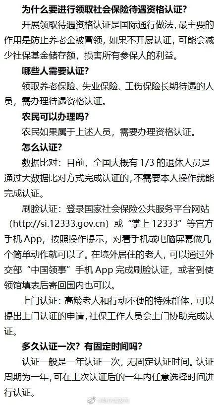 成都市实行的是滚动认证,待遇领取人员自领取待遇的次月起,每12个月认证一次。