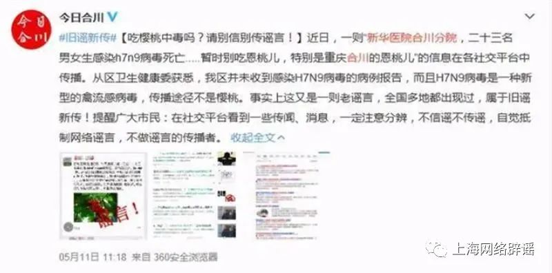 2021年5月11日,重庆市合川区委宣传部就曾回应过:“从区卫生健康委获悉,我区并未收到感染H7N9病毒的病例报告,而且H7N9病毒是一种新型的禽流感病毒,传播途径不是樱桃。”