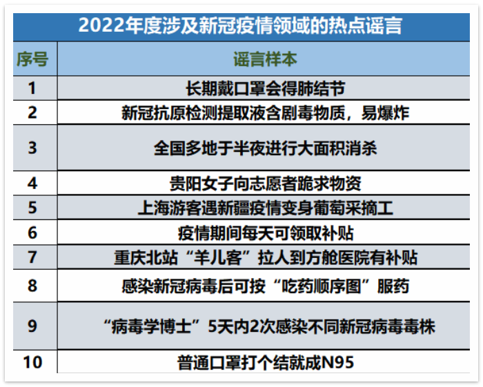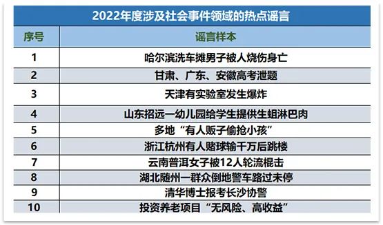 2022年,国际国内热点事件中,网络谣言“趁虚而入”,时有发酵,涉及疫情防控、公共政策、社会事件、医疗健康、自然现象等公众关心关切领域,可谓“套路百出”,令人深恶痛绝。针对网络谣言这一痼疾,中国互联网联合辟谣平台重拳出击,全年共受理网民谣言举报信息3万余条,汇集谣言样本和辟谣数据2.45万条,共发布各类辟谣稿件1.31万篇,推出了12期《打击网络谣言 共建清朗家园 中国互联网联合辟谣平台月度辟谣榜》、科学流言榜以及“涉防灾减灾辟谣榜”“涉化妆品辟谣榜”“涉高考高招辟谣榜”“涉食品安全辟谣榜”等行业辟谣榜单。这些谣言背后的真相您都了解了吗?中国互联网联合辟谣平台特此盘点解析,为您澄清谬误,传递事实真相。