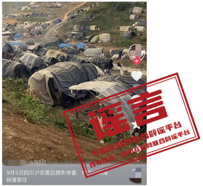 这类谣言往往通过移花接木拼凑而成,有的冒用不相干的图片或视频企图自证,有的依靠PS等拼接技术进行伪造,还有的利用人工智能和大数据生成仿真音视频信息。如“重庆嘉陵江被晒干了,两名男子骑摩托车横渡嘉陵江”“四川地震后村民在山脚下自搭帐篷居住”等谣言,均属于用“移花接木”手法编撰的虚假信息:前者实为水位降低的自然情况,横渡视频的拍摄地点是长江珊瑚坝而非嘉陵江;后者则是四川乐山笋农打笋时临时搭建的休息帐篷。此外,“浙江宁波北仑、慈溪被水淹”等视频还采用特效合成手法制造谣言,着实居心不良。