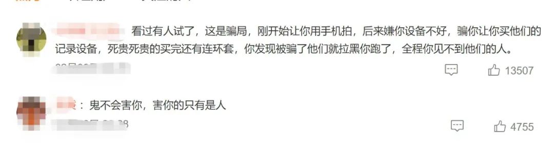 对此,网友表示质疑,称“看过有人试了,这是骗局,刚开始让你用手机拍,后来嫌你设备不好,骗你让你买他们的记录设备,死贵死贵的买完还有连环套,你发现被骗了他们就拉黑你跑了,全程你见不到他们的人”。