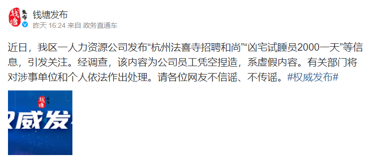 近日,我区一人力资源公司发布“杭州法喜寺招聘和尚”“凶宅试睡员2000一天”等信息,引发关注。经调查,该内容为公司员工凭空捏造,系虚假内容。有关部门将对涉事单位和个人依法作出处理。请各位网友不信谣、不传谣。