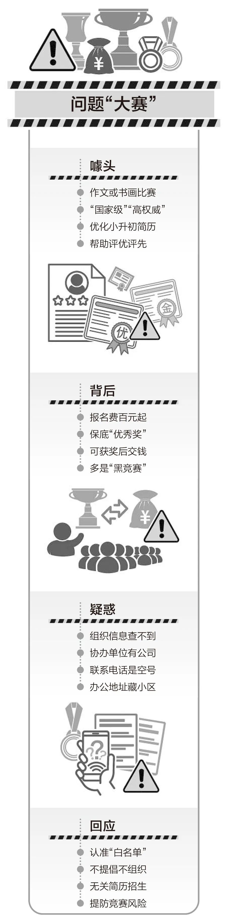 记者调查发现,如今以中小学生和家长为目标的各类违规竞赛依旧不少。不少“大赛”动辄标榜“国家级”,但“交钱就有奖”,其背后问题重重。