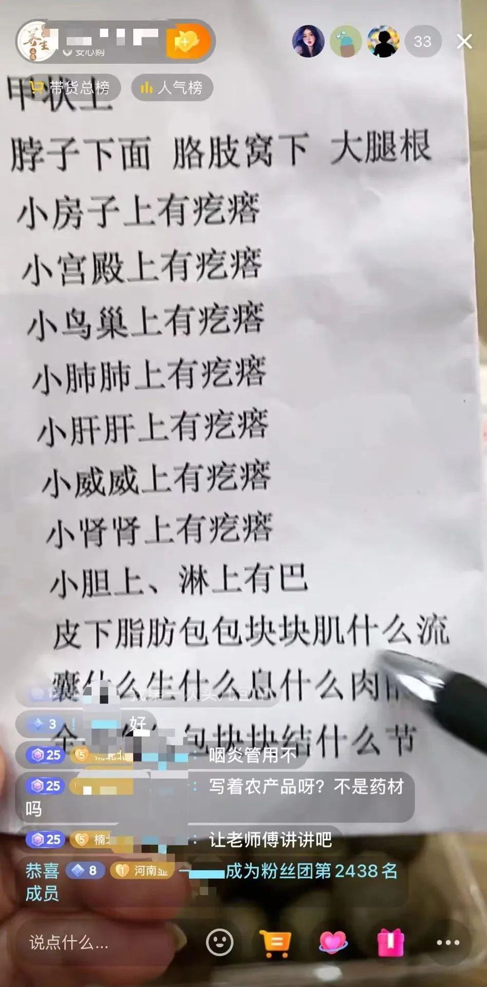 经过一段时间观察后记者发现,主播提及的“囊什么肿”等“奇怪”的词汇,实际上都是医药类术语:囊肿、息肉、结节、甲状腺、汤药等,之所以这样说,目的是为了躲避平台的违禁词审查。