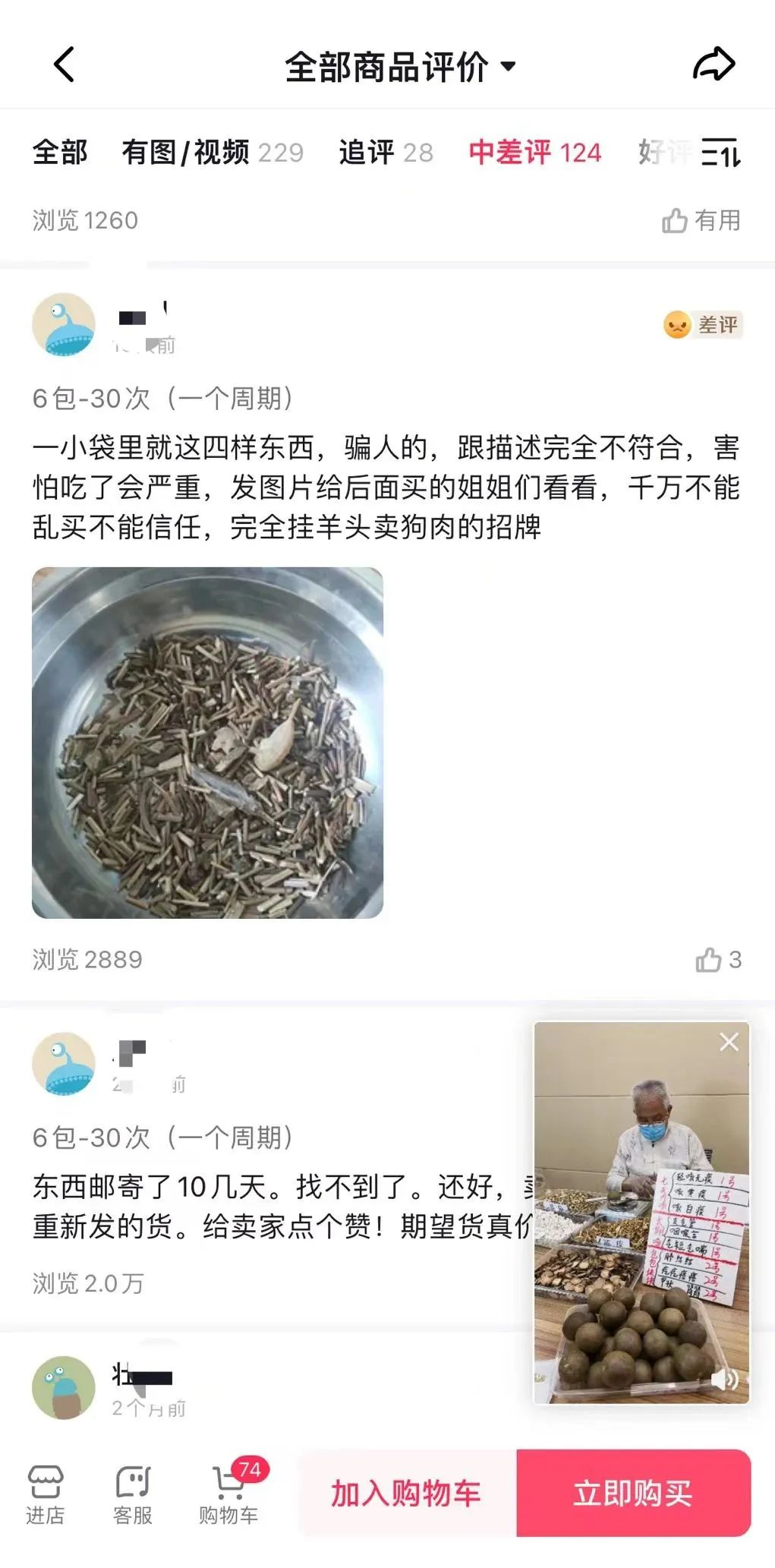 而在该款“散结汤”的详情页中,中差评达到数百条,有消费者写道:“喝了一段时间,啥效果也没有,病情严重的千万别乱买”“在药房里买同样的东西,比这里便宜好几倍”“打开一包,还混杂着一根生锈的钉子”……