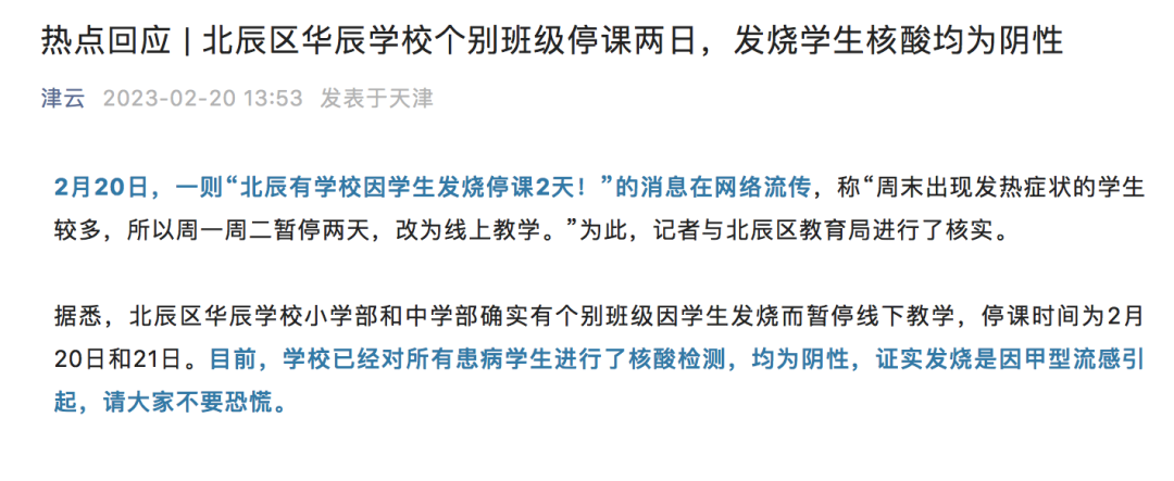 另据“津云”微信公众号消息,天津北辰区华辰学校小学部和中学部也有个别班级因学生发烧而暂停线下教学,停课时间为2月20日和21日。目前,学校已经对所有患病学生进行了核酸检测,均为阴性,证实发烧是因甲型流感引起。