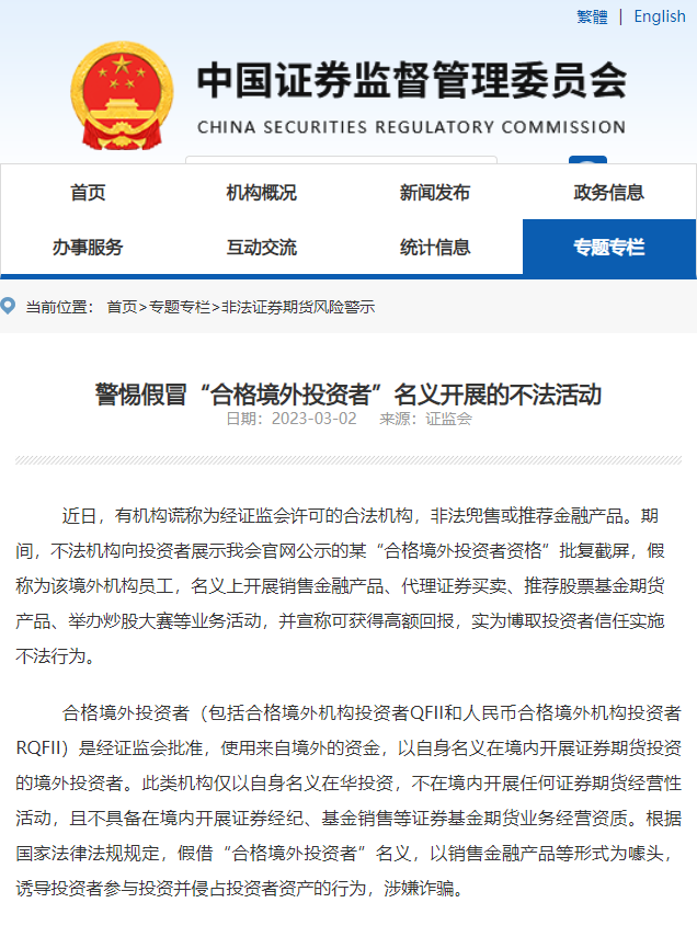 证监会在此提醒广大投资者,警惕并远离不法分子以“合格境外投资者”名义在境内开展的各类经营性活动,以免遭受财产损失。一旦发现,请及时向公安机关报案。
