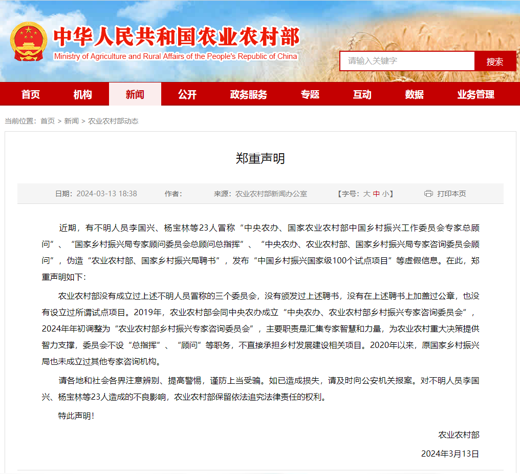 近期,有不明人员李国兴、杨宝林等23人冒称“中央农办、国家农业农村部中国乡村振兴工作委员会专家总顾问”、“国家乡村振兴局专家顾问委员会总顾问总指挥”、“中央农办、农业农村部、国家乡村振兴局专家咨询委员会顾问”,伪造“农业农村部、国家乡村振兴局聘书”,发布“中国乡村振兴国家级100个试点项目”等虚假信息。在此,郑重声明如下: