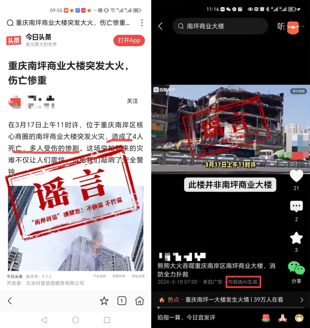 3月18日,网传消息称“重庆南坪商业大楼突发大火,伤亡惨重”,另有网友发布了经AI生成且图文严重不符的视频。