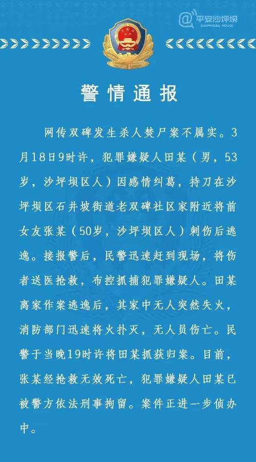 网传双碑发生杀人焚尸案不属实。3月18日9时许,犯罪嫌疑人田某(男,53岁,沙坪坝区人)因感情纠葛,持刀在沙坪坝区石井坡街道老双碑社区家附近将前女友张某(50岁,沙坪坝区人)刺伤后逃逸。