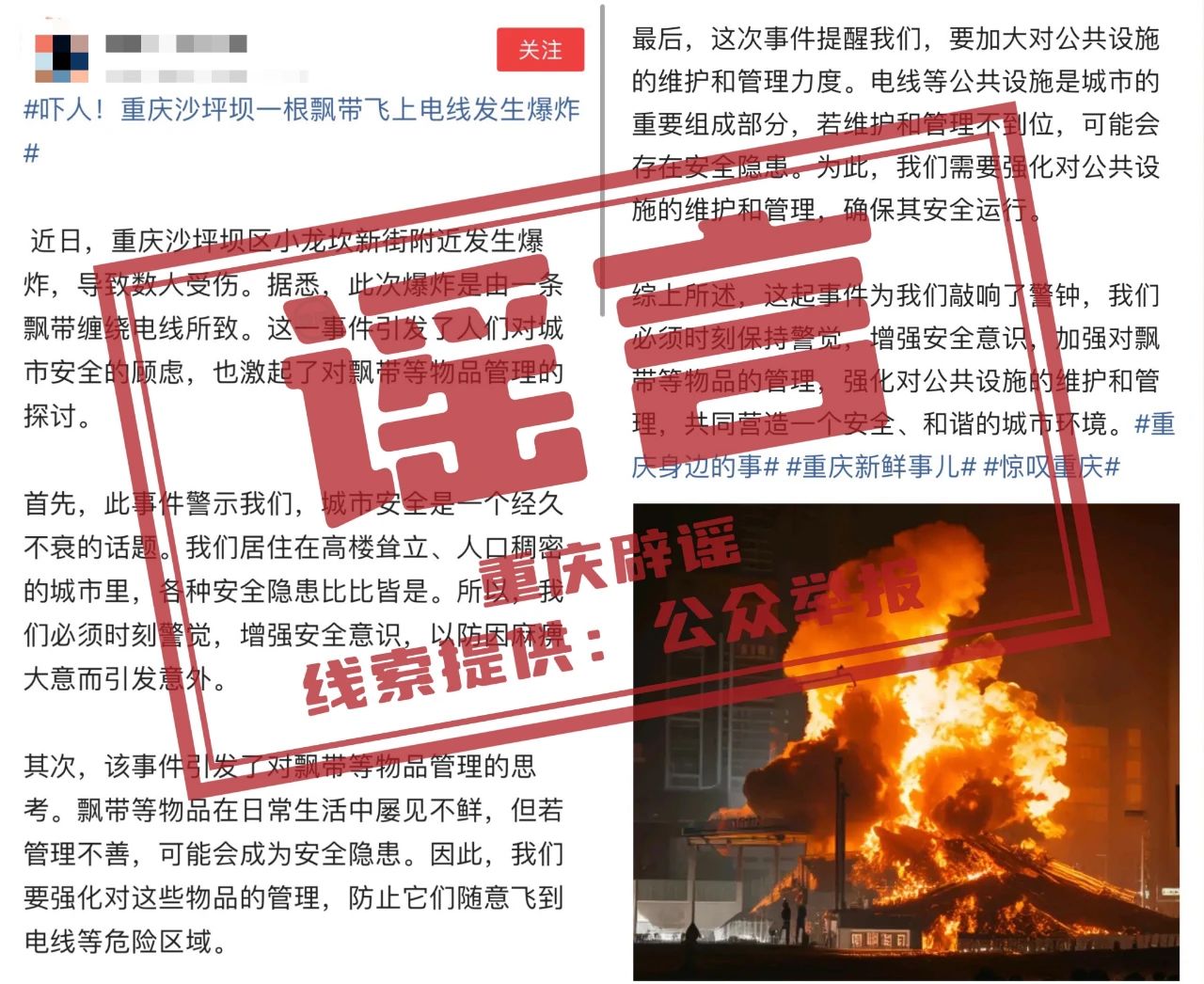 近日,有网民在某网络平台发布图文信息称:“重庆沙坪坝区小龙坎新街附近发生爆炸,导致数人受伤。”经核实,网民所发信息为谣言。