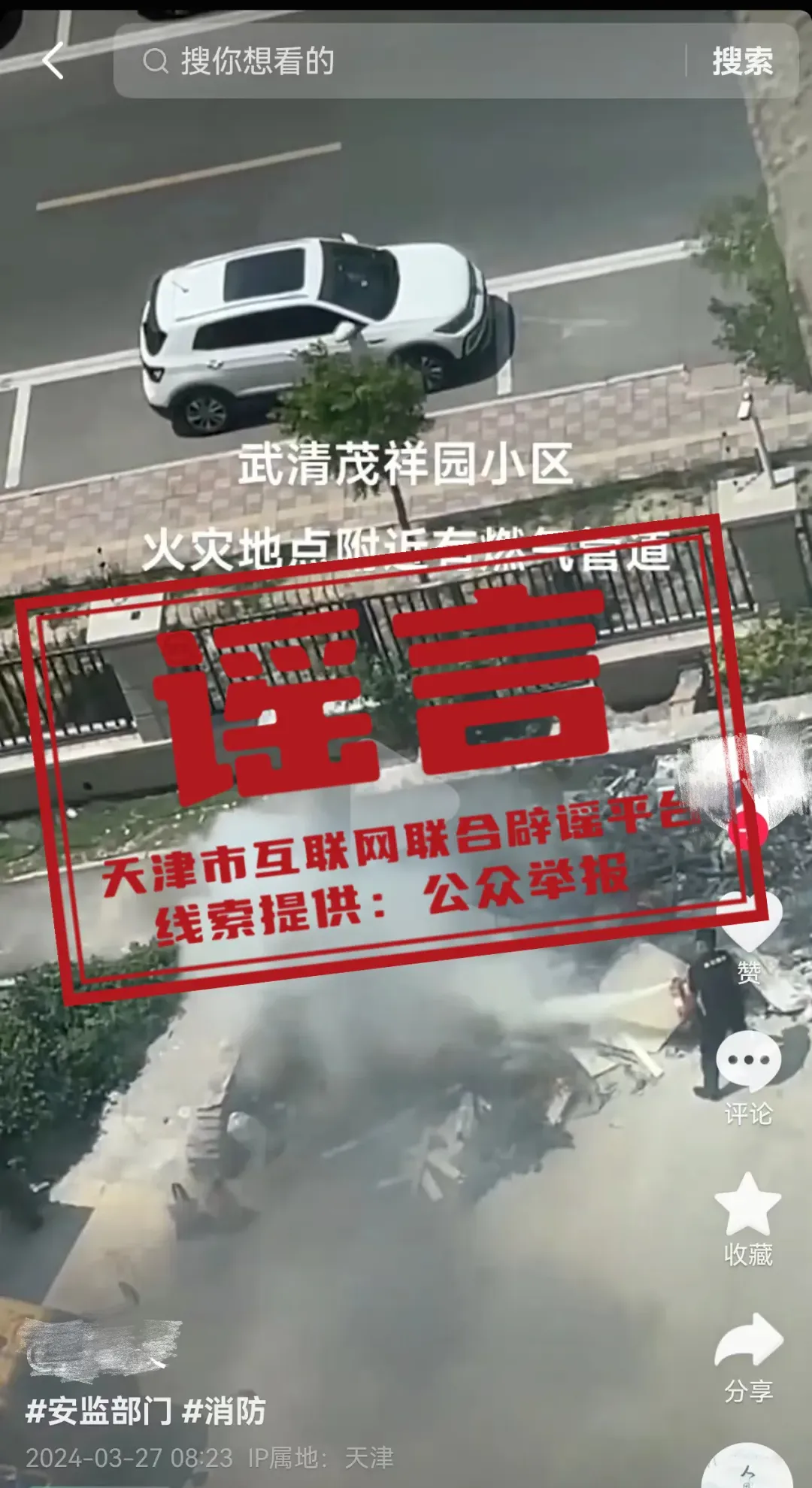27日,天津市武清区互联网违法和不良信息举报中心接网民举报,2024年3月27日8时23分,有网民发布抖音短视频称天津“武清茂祥园小区,火灾地点附近有燃气管道”。经与相关部门核实,真实情况是:2023年5月24日,茂祥园小区临时建筑垃圾存放点起火,第一时间即被扑灭。且该存放点设置规范,与燃气管道存在安全距离,不存在隐患问题。附近居民切莫恐慌,请广大网民不信谣,不传谣。