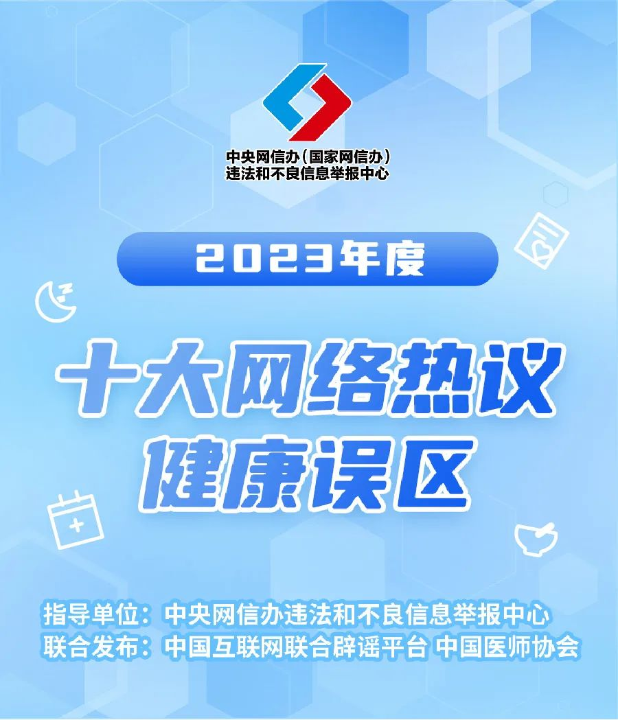 为守护人民群众生命健康,中国互联网联合辟谣平台、中国医师协会联合发布《2023年度十大网络热议健康误区》,澄清医疗健康、饮食营养、科学运动等方面的误区,帮助网民提升识谣辨谣能力。