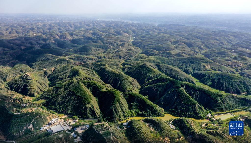 黄土沟壑中的陕西榆林市米脂县银州街道高西沟村满眼绿色(9月10日摄,无人机照片)。新华社记者 陶明 摄