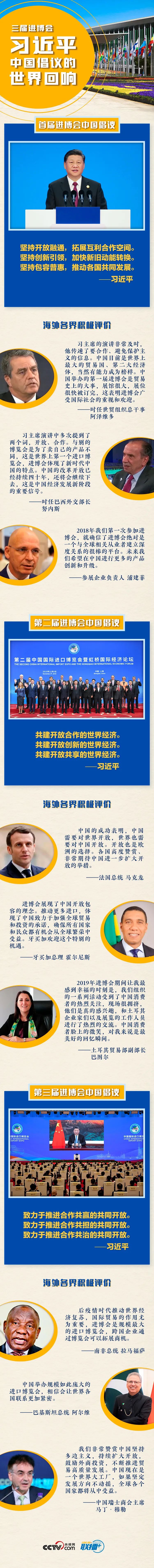 在历届进博会上,习近平主席都提出了推动建设开放型世界经济的中国倡议,宣布了中国扩大对外开放的一系列务实举措,赢得国际社会的广泛认同。
