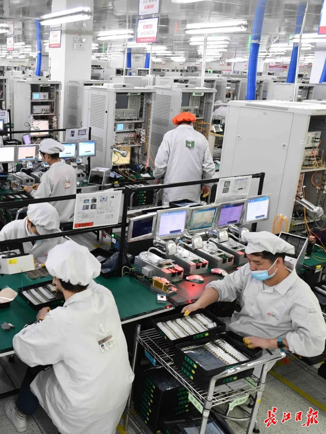 华工科技核心子公司华工正源5G模块生产车间,工人在生产线上忙碌。 记者高勇 摄