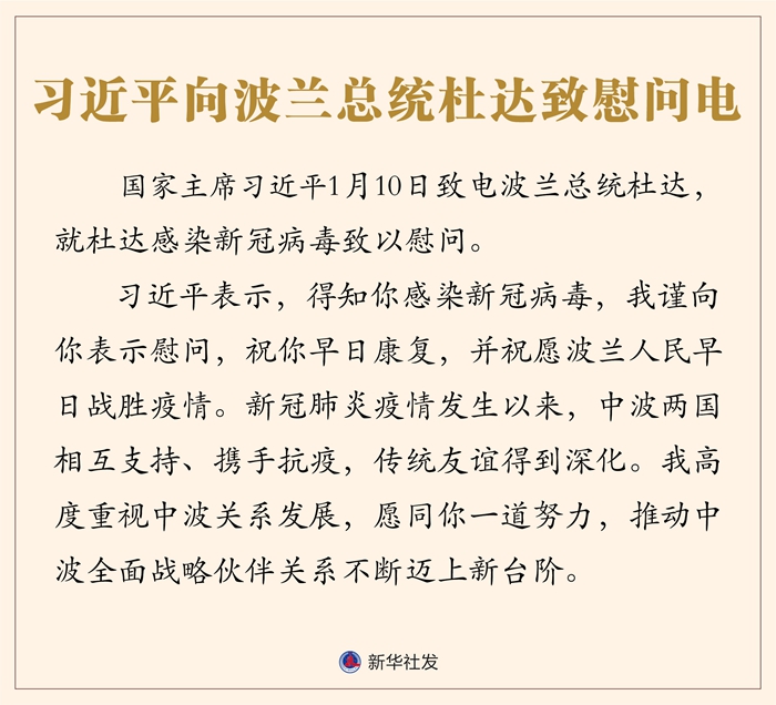 新华社北京1月11日电 国家主席习近平1月10日致电波兰总统杜达,就杜达感染新冠病毒致以慰问。