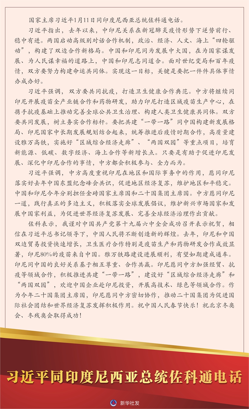 新华社北京1月11日电 国家主席习近平1月11日同印度尼西亚总统佐科通电话。