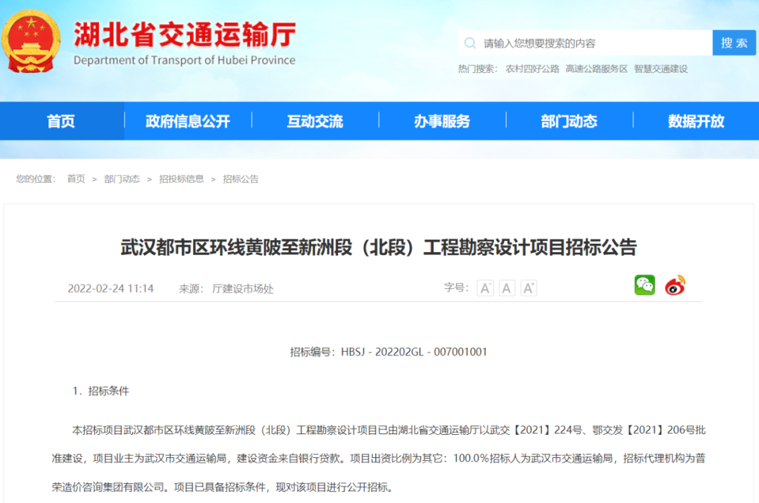 公告显示,本招标项目武汉都市区环线黄陂至新洲段(北段)工程勘察设计项目已由湖北省交通运输厅以武交【2021】224号、鄂交发【2021】206号批准建设,项目业主为武汉市交通运输局,建设资金来自银行贷款。