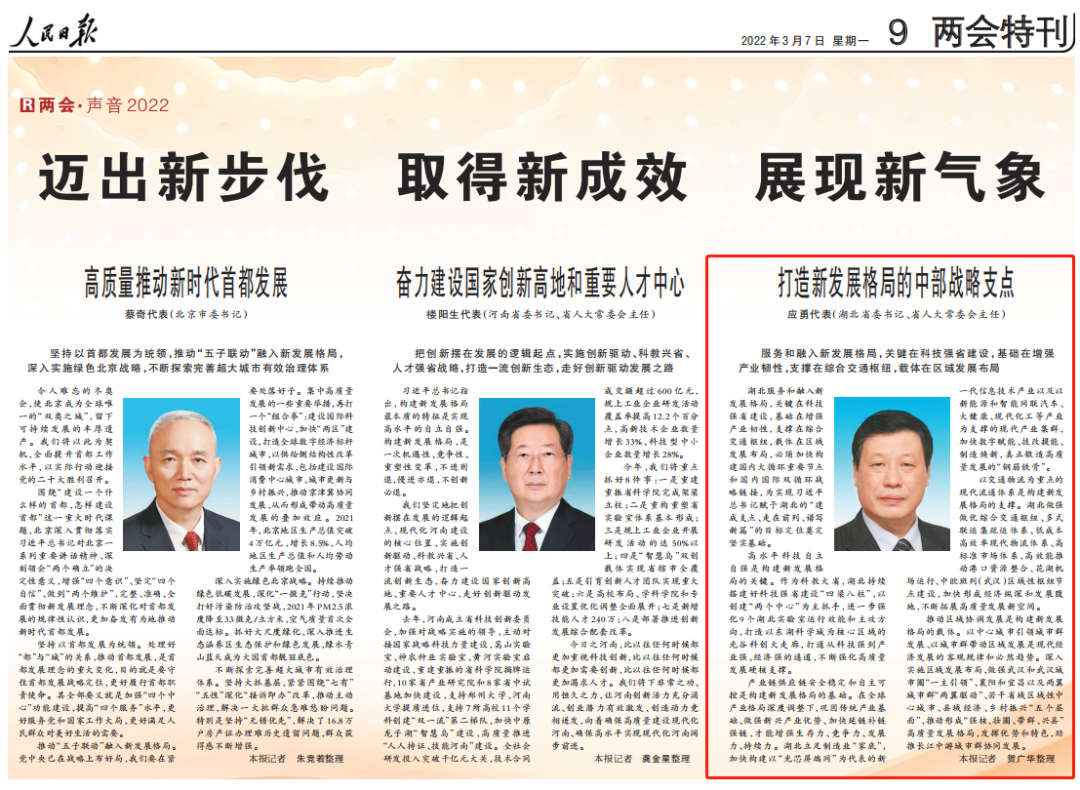 今日出版的《人民日报》两会特刊刊发湖北省委书记应勇文章《打造新发展格局的中部战略支点》。