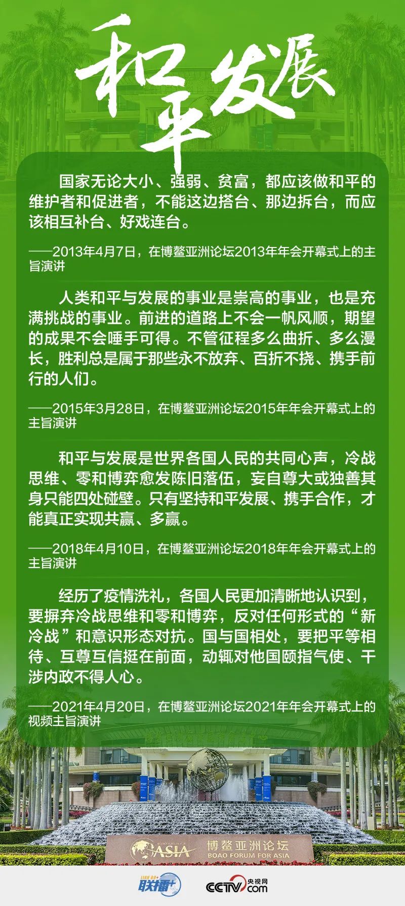 世界正处于大发展大变革大调整时期,和平与发展仍然是时代主题。在博鳌亚洲论坛这一具有世界影响力的高层次对话平台上,习近平主席多次就此作出重要论述。