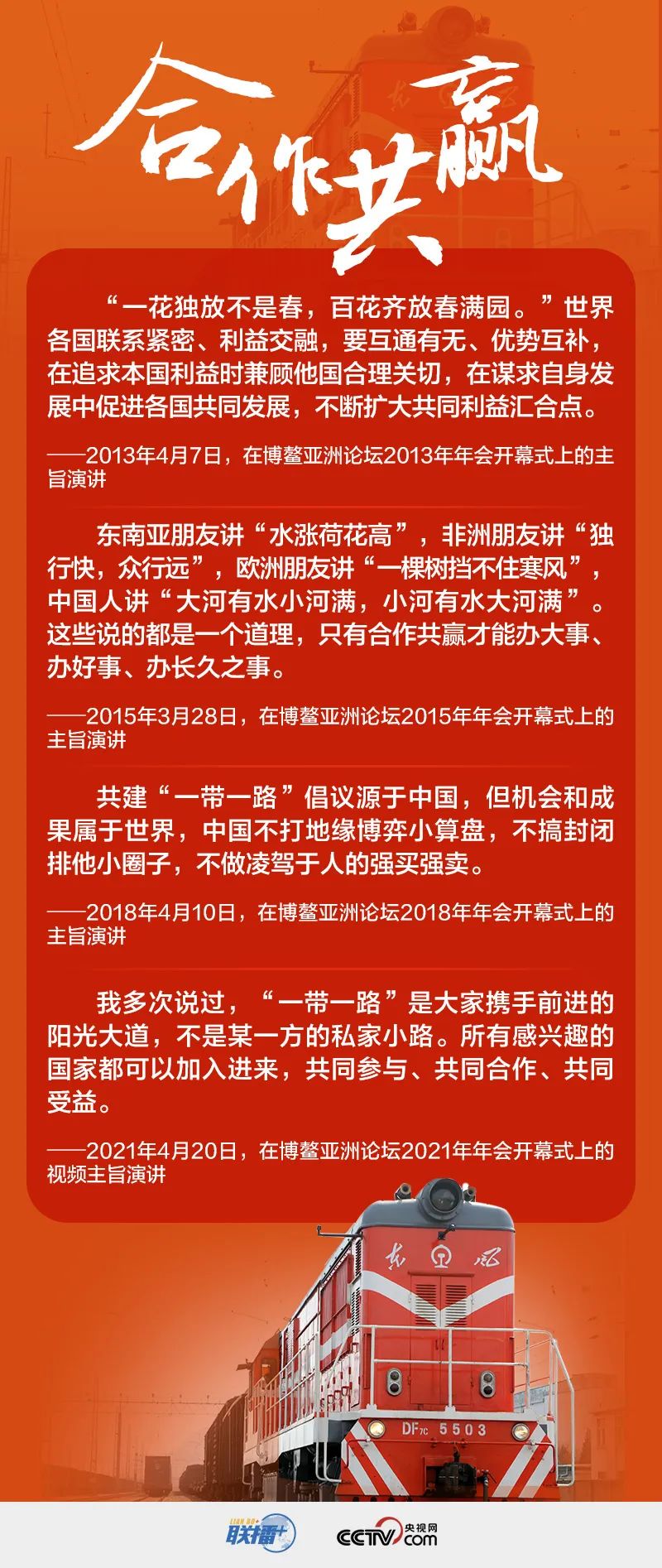 “一带一路”倡议追求发展、崇尚共赢、传递希望,正是“百花齐放春满园”的写照。自首倡“一带一路”以来,习近平主席在博鳌亚洲论坛既积极宣介倡议内涵,也及时廓清杂音,强调“共建‘一带一路’倡议源于中国,但机会和成果属于世界”。