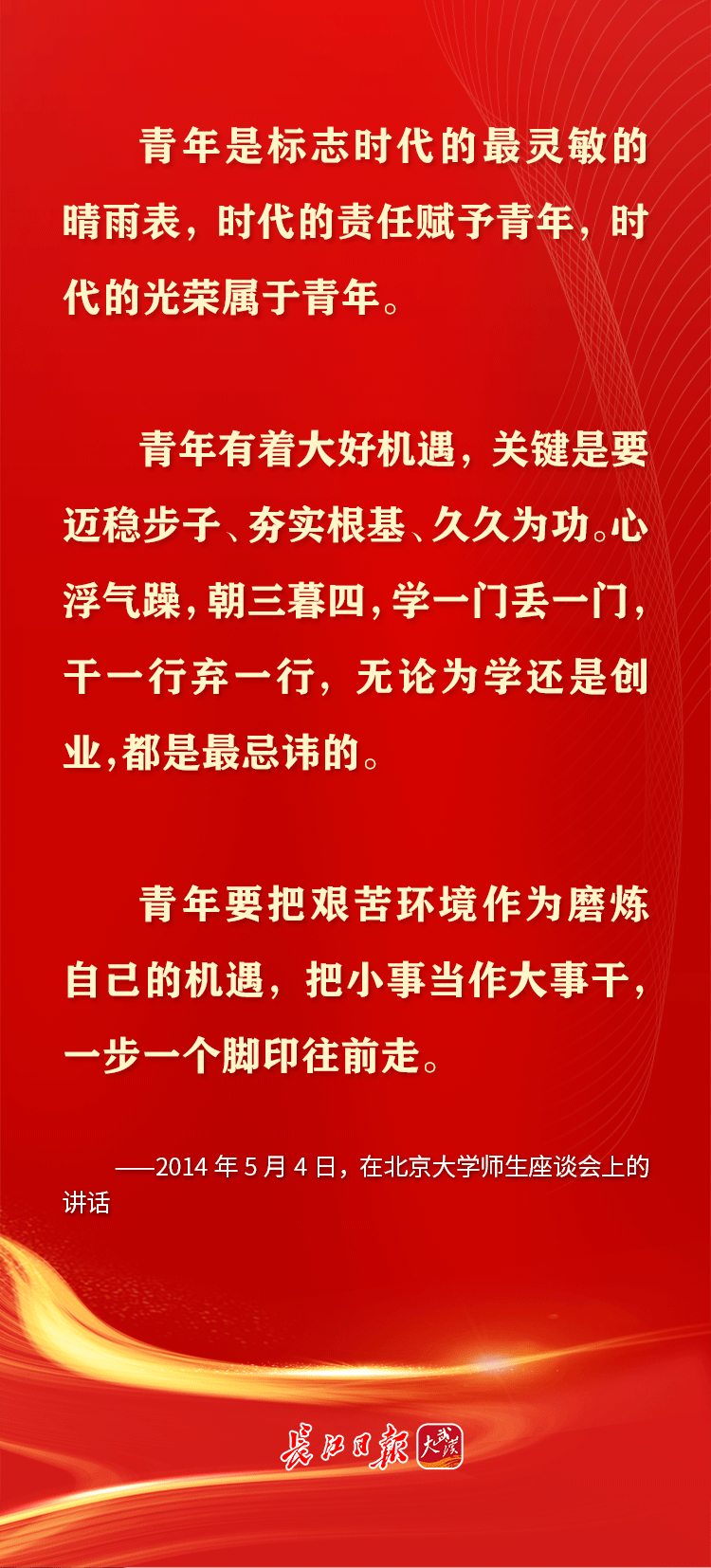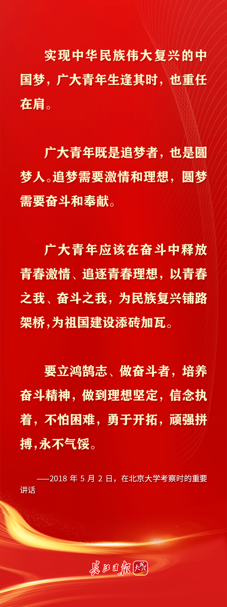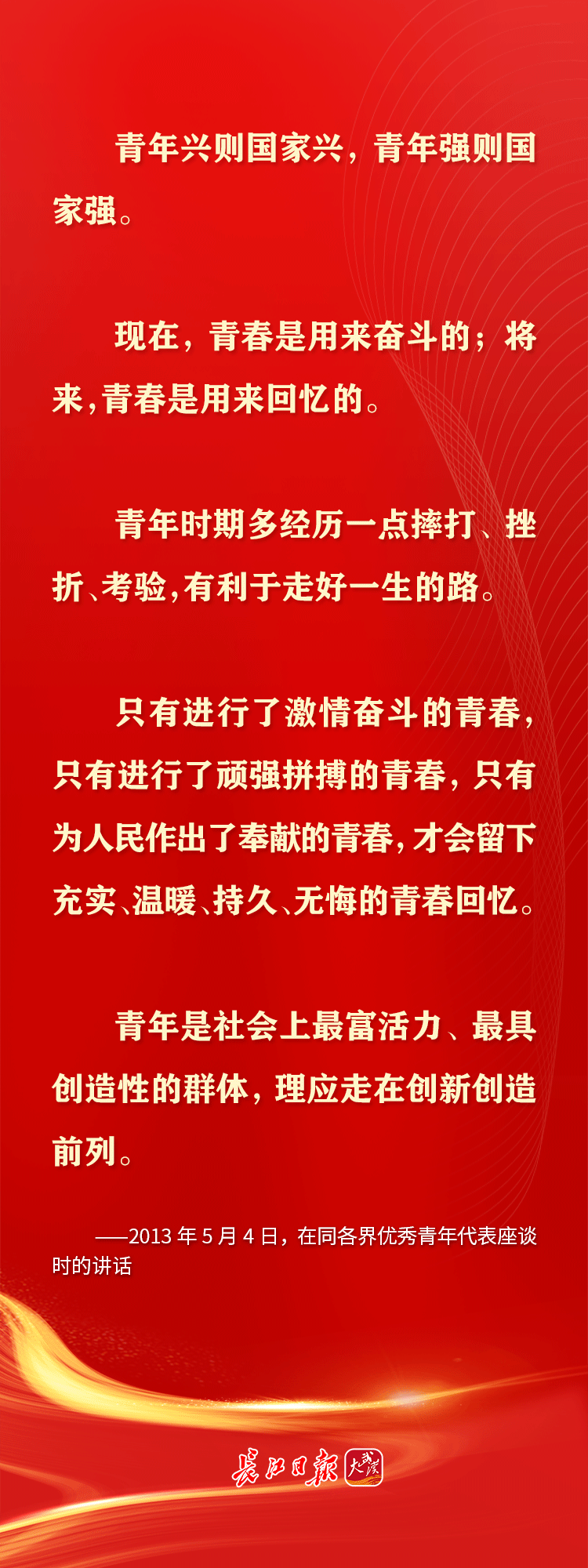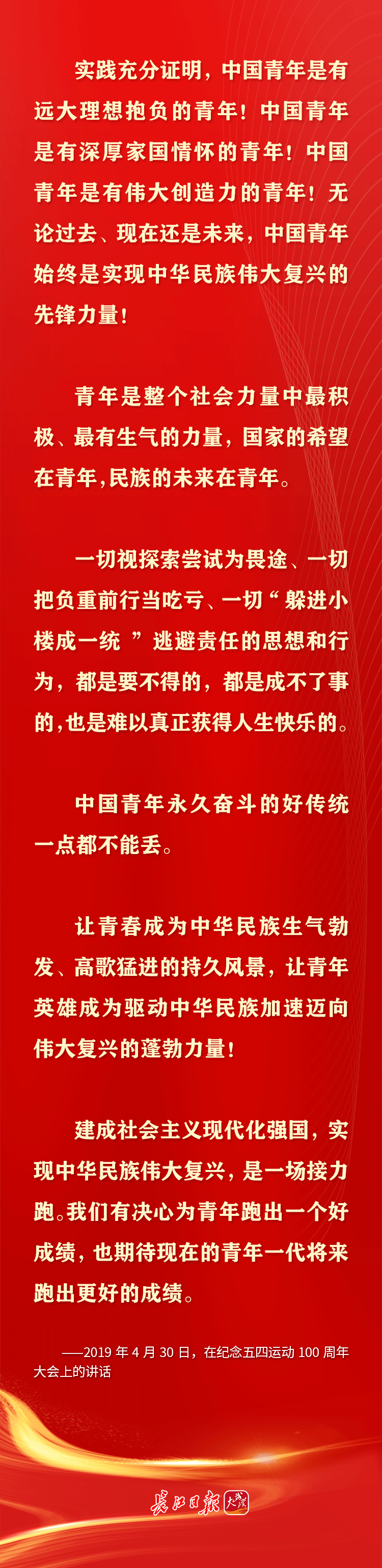青年是早晨八九点钟的太阳,是祖国的未来、民族的希望。习近平总书记十分关心青年成长,党的十八大以来,多次通过座谈、演讲等方式对青年寄予殷切期望,鼓励青年追求梦想、努力奋斗。在共青团成立100周年的日子,让我们重温习近平总书记对青年的那些青春寄语。