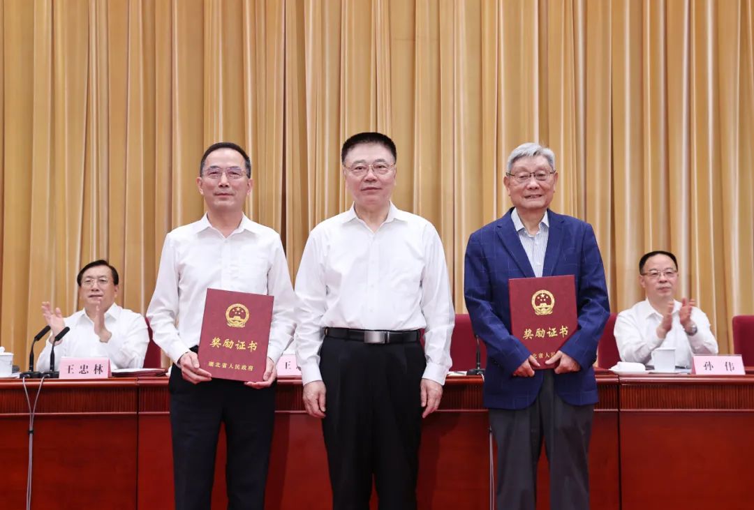 在热烈的掌声中,王蒙徽为2021年度湖北省科学技术突出贡献奖获得者潘垣院士、高宗余院士颁奖,同他们亲切握手合影,邀请他们在主席台就座,并一起为2021年度湖北省科学技术奖获奖代表颁奖。