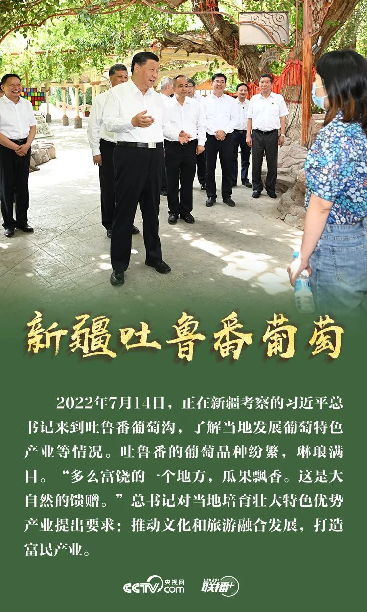 “多么富饶的一个地方,瓜果飘香。这是大自然的馈赠。”7月14日,正在新疆考察的习近平总书记走进吐鲁番葡萄沟,了解当地发展特色产业等情况。