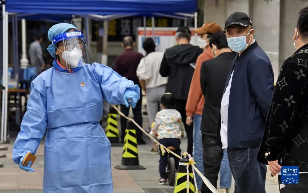 共产党员、北京八里庄街道机关干部张茜(左)在核酸筛查现场进行秩序维护(2022年5月11日摄)。新华社记者 李欣 摄