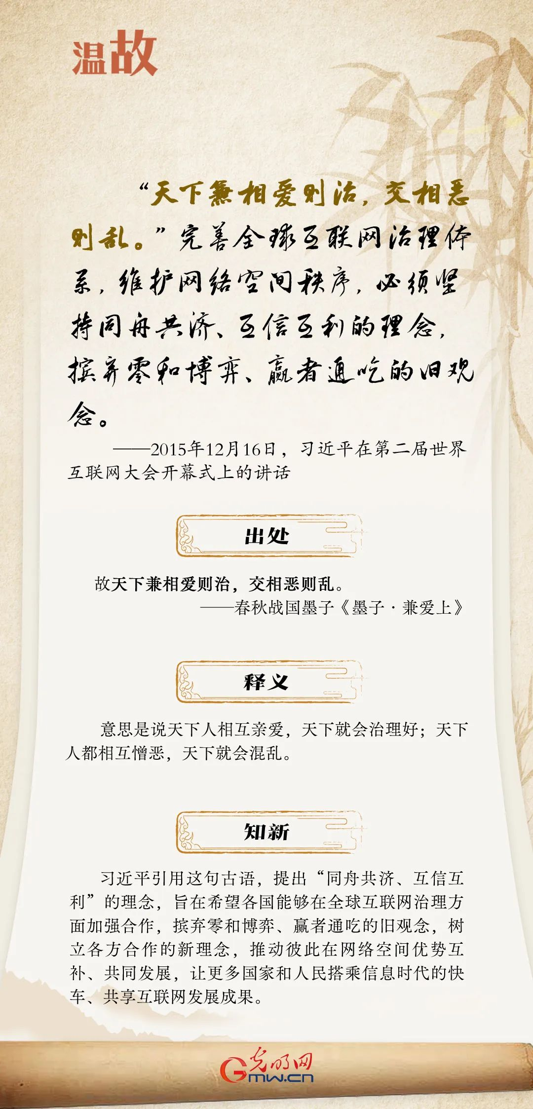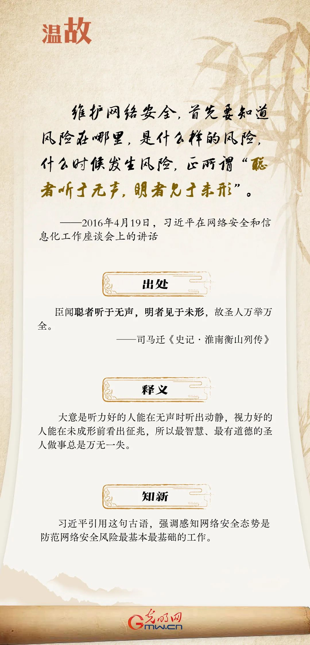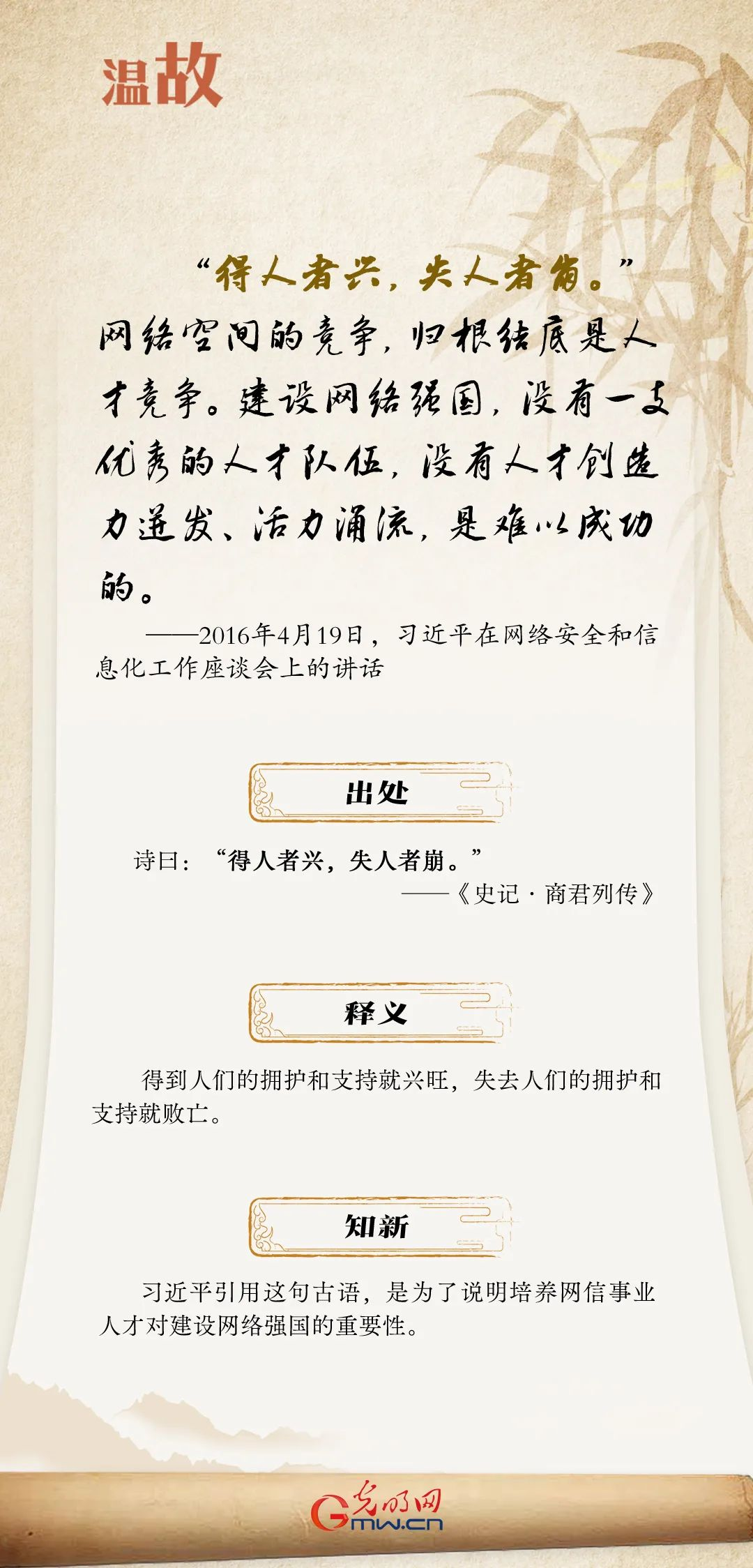 党的十八大以来,以习近平同志为核心的党中央对维护网络安全、培养网络人才、创新网络技术等方面作出一系列重要部署。习近平总书记在不同场合多次引经据典讲述网络治理的现实意义,妙语频出、发人深省,为网络强国建设指明方向。一起看习近平总书记如何把古人智慧运用到网络强国建设实践之中。