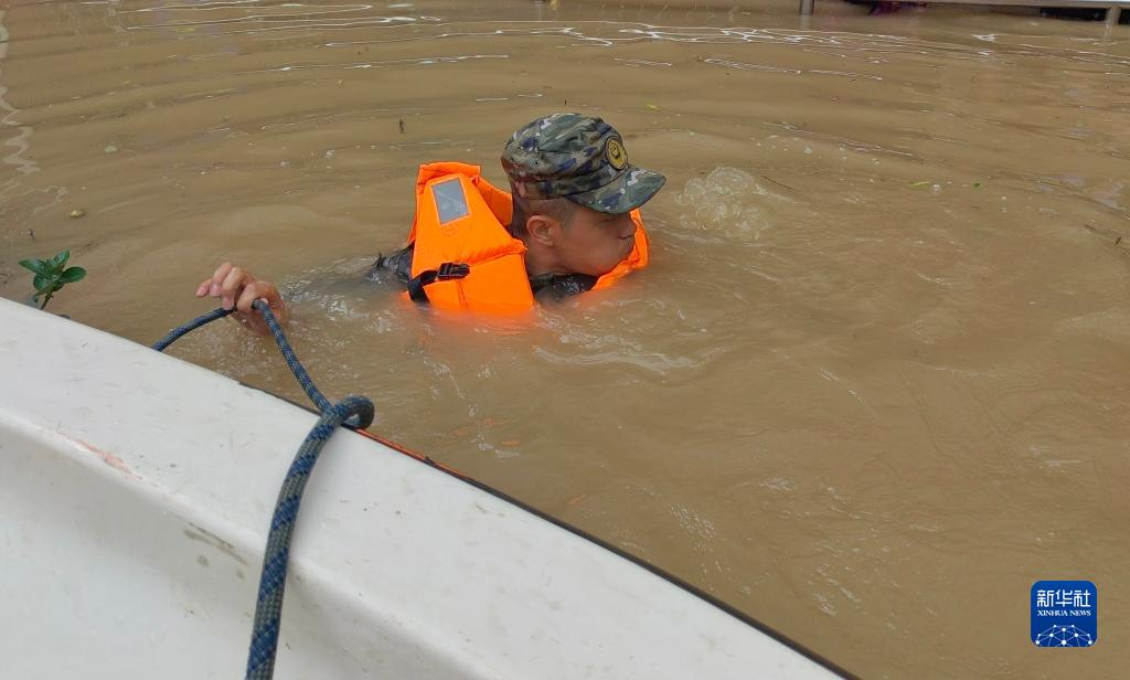 武警河北总队机动支队战士在河北涿州平安小区准备救助群众上冲锋舟(8月2日摄)。新华社发(梁学峰 摄)
