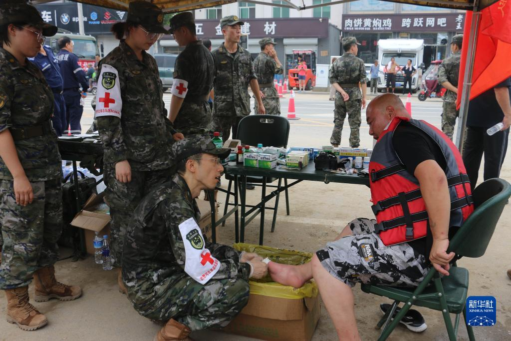 武警河北总队医院派出医疗分队赶赴河北涿州受灾地区,开设便民医疗服务点,为群众包扎伤口(8月4日摄)。新华社发(杨雪乾 摄)