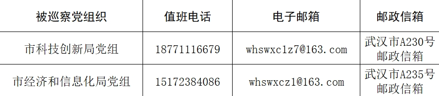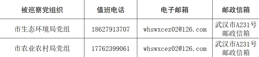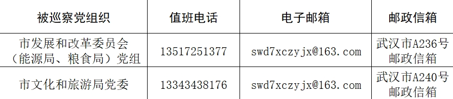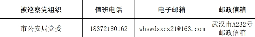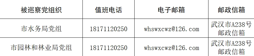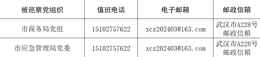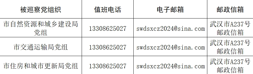 本轮专项巡察工作时间为40天左右,其间设立专门值班电话、邮政信箱、电子邮箱和“荆楚码上巡”信访反映二维码,主要受理反映被巡察党组织领导班子及其成员、下一级主要负责人和重要岗位领导干部问题的来信、来电,重点是关于违反政治纪律、组织纪律、廉洁纪律、群众纪律、工作纪律和生活纪律等方面的举报和反映。巡察组受理信访时间:4月25日截止。
