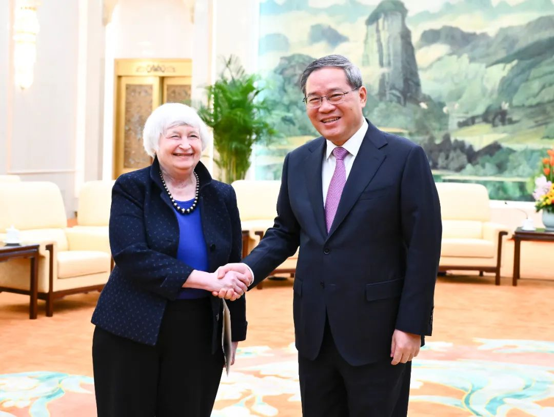 国务院总理李强4月7日上午在北京人民大会堂会见美国财政部长耶伦。