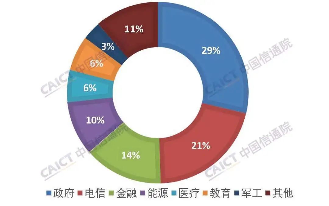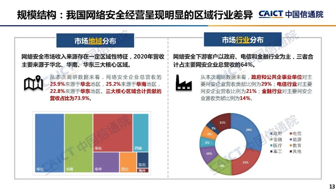 3、我国网络安全市场存在一定区域行业性特征,2020年华北、华南、华东三大核心区域合计贡献的营收占比为73.9%。下游客户以政府、电信和金融行业为主,三者合计占市场总营收的64%。