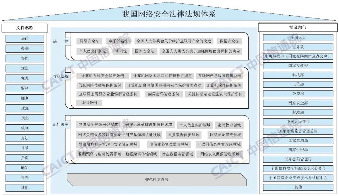 4、我国已出台关于网络与数据安全的法律、行政法规、部门规章、规范性文件等共计两百多部,形成了覆盖网络安全等级保护、关键信息基础设施安全保护、网络关键设备和网络安全专用产品管理、国家网络安全事件管理、密码管理、跨境活动网络安全管理、数据安全管理、个人信息保护等领域的网络安全法律法规体系。