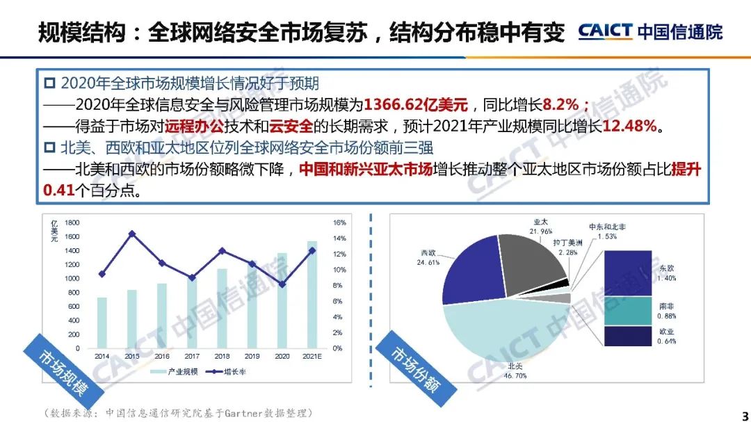 1、2020年全球网络安全市场规模为1366.6亿美元,同比增长8.2%,增速低于2019年同期水平,但高于2020年6月Gartner预测数据。