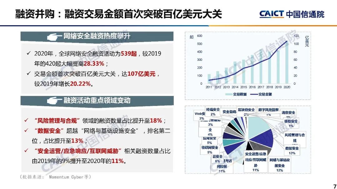 6、2020年我国网络安全领域融资保持较高热度。据不完全统计,2020年我国网络安全领域的融资活动为77起,披露的融资总额约为78.2亿元。从融资的技术领域来看,数据安全、安全服务和工控安全是2020年较为热门的网络安全融资领域,对应的融资活动占比均超过10%。