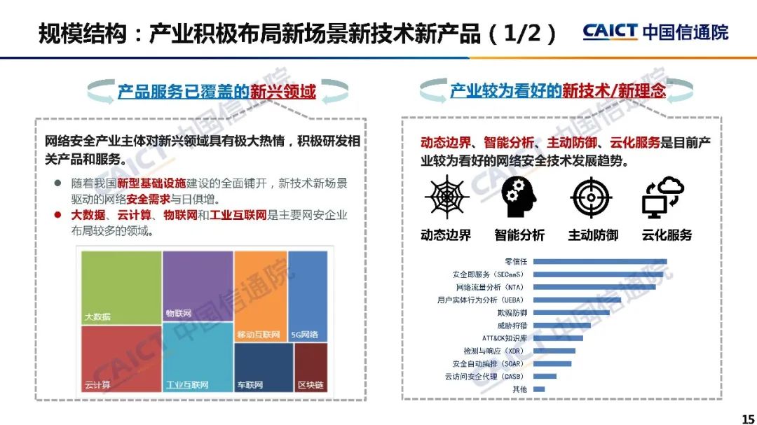 7、网络安全产业对新兴领域具有极大热情,积极研发相关产品和服务。其中,大数据、云计算、物联网和工业互联网是市场主体布局较多的领域,动态边界、智能分析、主动防御、云化服务是目前市场较为看好的网络安全技术发展方向。